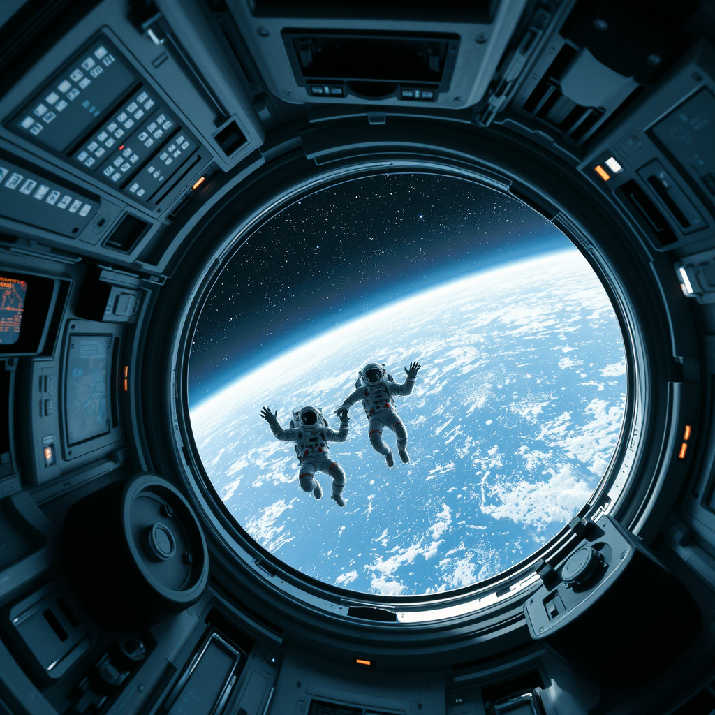 In a minimalist and futuristic style, reminiscent of John Berkey, the scene captures the interior of a spacecraft from an overhead perspective. Two astronauts drift freely in zero gravity, their suits slightly illuminated by the soft glow of control panels. Nearby, an open circular hatch is framed by large black wheels and intricate lights, hinting at the complexity of space travel. Through the open hatch, the vastness of space stretches outwards, dotted with a mesmerizing starry sky that emphasizes the contrast between human innovation and the infinite universe.
