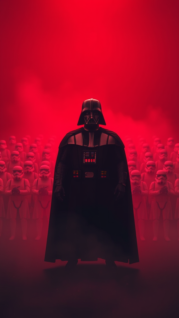In a misty battlefield bathed in a mesmerizing crimson glow, Darth Vader stands poised at the center, his ominous silhouette framed by an ethereal red light that casts dramatic shadows. Behind him, an imposing army of stormtroopers, perfectly aligned, creates a powerful sense of symmetry and order against the soft mist. The scene captures an otherworldly beauty, where darkness and light intertwine to highlight the formidable presence of the Dark Lord, as the stormtroopers await his command under the blood-red sky.