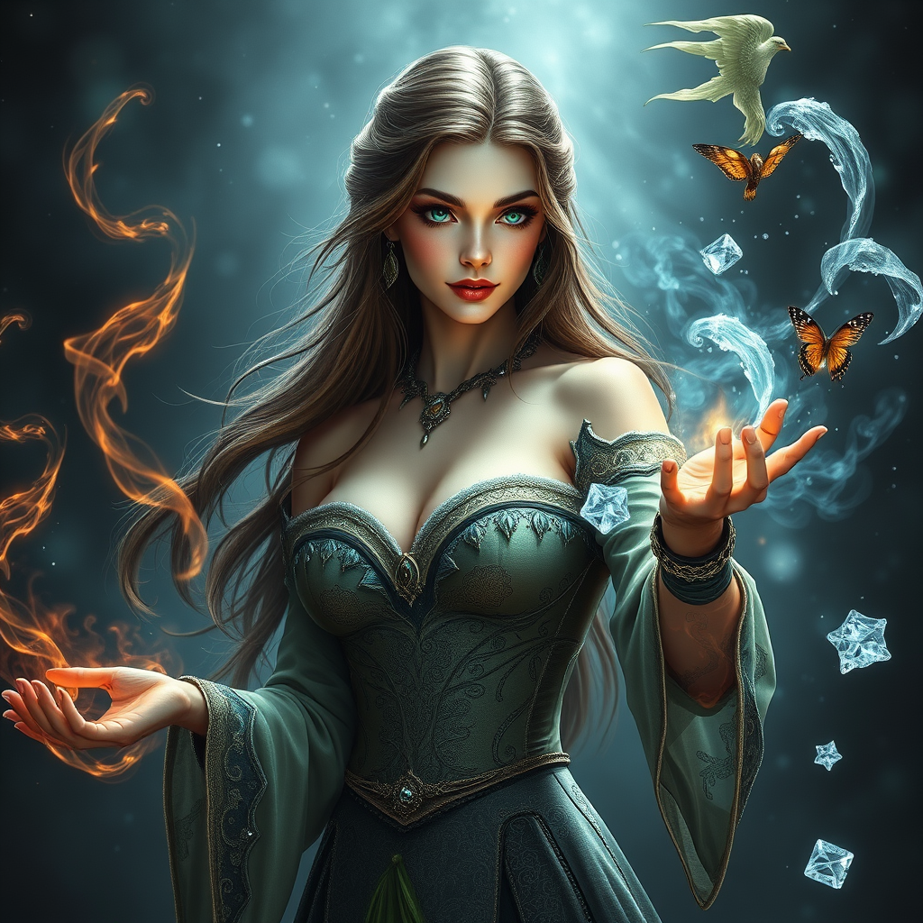 In a mystical dark fantasy realm, a graceful and slender female wizard stands poised, casting a mesmerizing spell with swirling elemental energies. Her elegant, off-shoulder attire, adorned with intricate patterns and shimmering gems, enhances her delicate features. Her fair skin radiates under a soft, otherworldly glow, highlighting her entrancing green eyes and bewitching smile. Elements of fire, water, wind, and ice dance in perfect harmony, creating a captivating, dynamic composition that forms an exquisite, ultra high-resolution masterpiece.