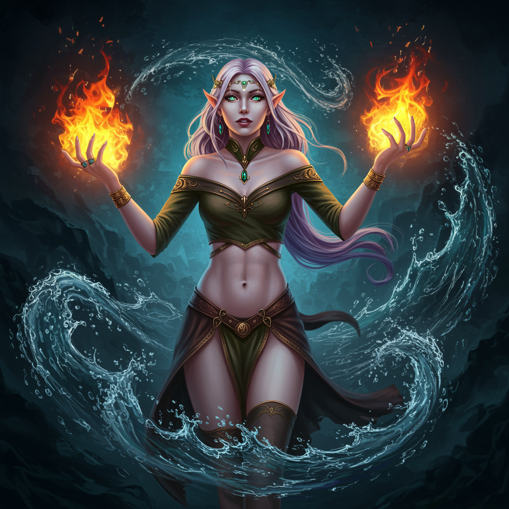 In a mystical dark fantasy realm, a graceful and slender female sorceress stands poised, weaving an enchanting spell with swirling elemental energies. Clad in a captivating, off-shoulder ensemble adorned with ornate rings, her attire showcases intricate designs and textures. Her radiant, fair skin glows softly in ethereal light, highlighting her mesmerizing green eyes and enchanting smile. Elements of fire, water, wind, and ice perform a harmonious, dynamic dance around her, forming a striking, high-resolution masterpiece.