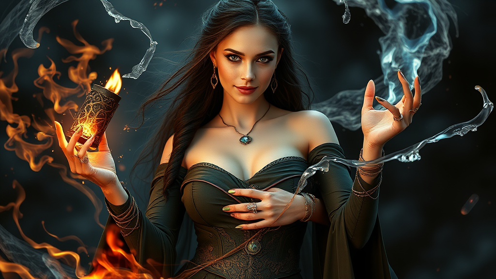 In a mystical dark fantasy realm, a stunningly slim female sorceress stands commandingly, weaving a captivating spell with elemental forces elegantly spiraling around her. She dons a bewitching off-shoulder ensemble bedecked with intricate rings, each one featuring delicate and ornate designs. Her radiant, fair skin is illuminated by a soft, otherworldly glow, emphasizing her spellbinding blue eyes and enchanting smile. Flames, water droplets, gusts of wind, and shards of ice intertwine in a harmonious and dynamic composition, creating an awe-inspiring, ultra high-resolution masterpiece.