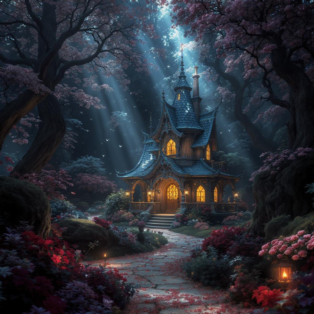 In a mystical fairy tale wonderland enveloped by lush nature, a small magical wooden house stands prominently in the center, surrounded by an enchanting, dark environment. The house glows warmly, with light filtering through its ornate windows and delicate lanterns casting gentle illumination all around. The view is symmetrical, highlighting the incredible detail of this awe-inspiring home, intricately crafted with rustic wood. An ambiance of ethereal beauty prevails, with maximum details showcased in the blooming flora that frames the scene. Radiant light rays pierce through the dense canopy above, creating a spectacular play of shadows and highlights. The photorealistic portrayal captures the enchanting allure and cinematic quality of this wonderland, enhanced by subtle ambient occlusion and the raw authenticity of a captivating spectacle.