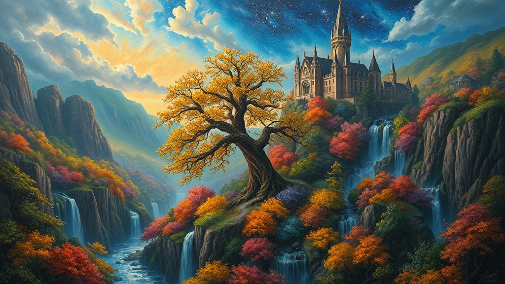 In a mystical realm lies an enchanting city nestled within a fae wild forest, where the landscape is adorned with towering cliffs and cascading waterfalls. The vibrant tapestry of multicolored trees paints a mesmerizing picture, with a colossal tree standing majestically at the heart of this magical haven. Atop this wondrous scene rises a grandiose castle, its spires piercing the sky, as if in conversation with the heavens. The forest is alive with the rustle of leaves whispering secrets, and the gentle glow of luminescent flora casting ethereal hues across the landscape. This fantastical world is captured in an oil canvas painting, each brushstroke breathing life into the mystical aura of the city, inviting you to wander through its wonders.