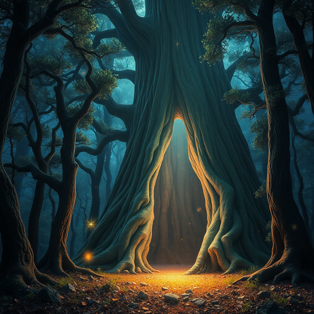 In a mystical, time-worn forest, majestic trees adorned with luminescent, galaxy-speckled foliage reach for the heavens. A colossal, hollow trunk functions as a radiant gateway to another realm, pulsating with celestial energy. Stardust-infused fireflies dance through the air, and the forest floor glistens with shards of astral stones and cosmic powders. The ambiance thrums with enchantment and the hushed murmurs of the cosmos.