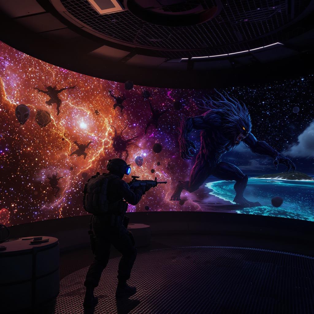 In a near-future world where soldiers are honed in virtual reality configurations, designed to maximize their encounter and proficiency, an insidious virus infiltrates the program, leaving them stranded in these hyper-realistic simulations. The virtual menaces become corporeal, launching a relentless assault. Meanwhile, a cursed prince, transformed into a beast, roams within the void, mirroring a blend of fairy tale fantasy and technological chaos. The scene is captured through the lens of a Nikon D3500 and a Hasselblad X1D - 50c, employing a fusion of cinematic effect and natural texture reminiscent of Alfred Stieglitz and Robert Capa’s iconic styles. Against backgrounds of vibrant nebulae and a breathtaking island lagoon under a moody yet bright lighting, elements such as a Future Circular Collider and a mysterious mask add intrigue. The atmosphere, influenced by Gesaffelstein’s ‘Pursuit’, creates a mesmerizing tension. Showcasing dynamic action and epic poses, the environment boasts hyper-realistic and photorealistic details captured in 8K Ultra-HD. Natural and volumetric lighting heightens the drama, enhanced by the nuances of science fiction intertwined with social narratives, depicted in ultra-detail, employing techniques like ray tracing and long exposure to convey a story of blurred realities where safety blurs into danger.
