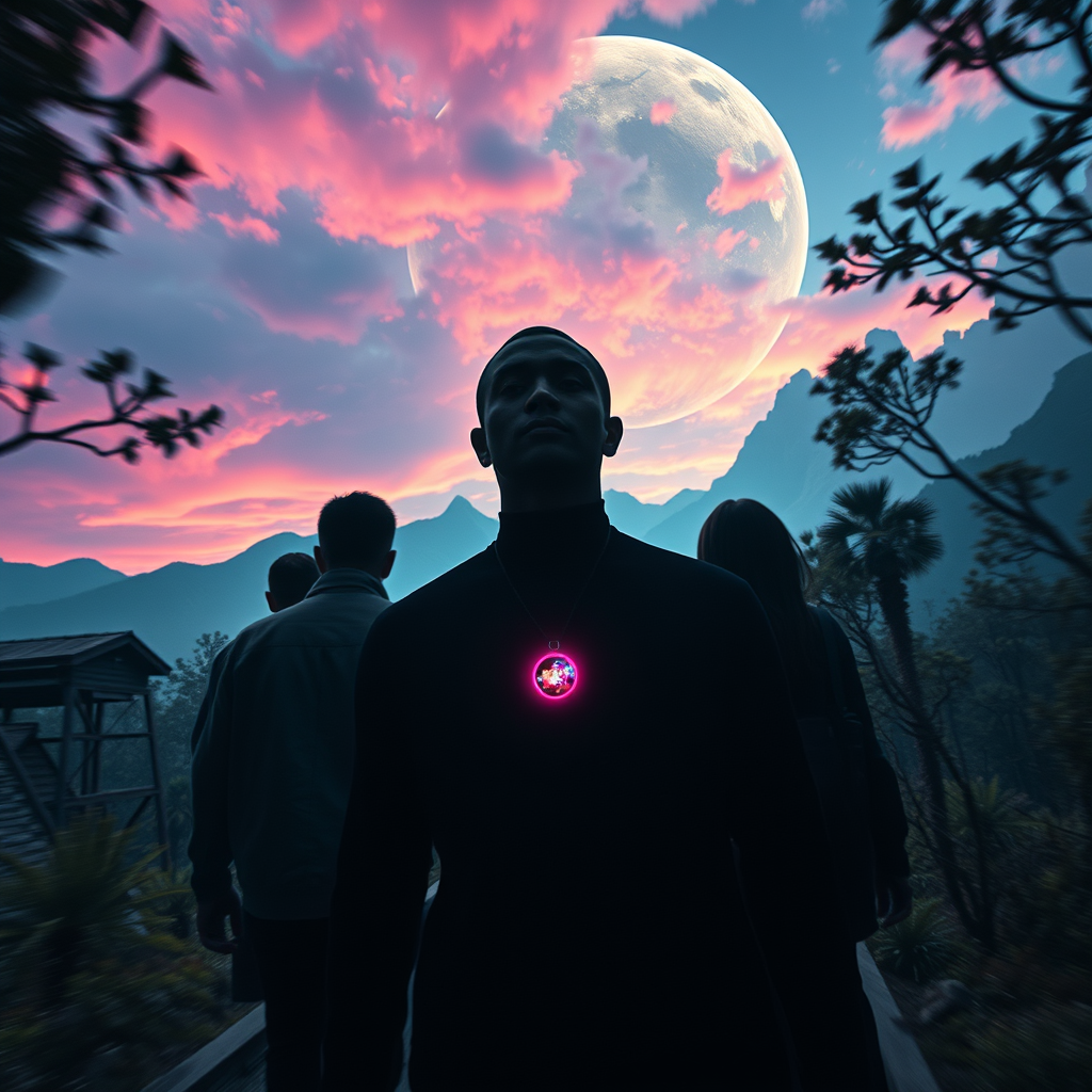 In a near utopian society where cybernetic implants monitor brains, filtering out negativity and rewarding positive thoughts, a tech-savvy hacker group discovers a way to breach this system, accessing people's darkest thoughts. Simultaneously, a band of adventurers embarks on a quest to a mystical land to find a legendary flower believed to have extraordinary healing properties. This landscape combines futuristic cyberpunk elements with the lush backdrop of a vibrant, magical jungle. Amidst this vivid setting, a scene unfolds with individuals en route to Cheyenne Mountain, navigating through an asteroid field against a dieselpunk skyline. The action-packed frame captures an enigmatic figure, their silhouette adorned with a glowing pendant. The photographs, influenced by legendary artists like Lee Friedlander and Irving Penn, blend natural textures with cinematic lighting techniques, creating hyper-realistic, detailed visuals. The scene, shot with a Fujifilm X-T4 and Hasselblad X1D-50c, utilizes advanced cinematic effects such as long exposure and blur, framed in ultra-HD with a play of volumetric lighting that adds depth and mood. This hyper-realistic depiction, in the style of 'Pursuit' by Gesaffelstein, paints a vibrant picture with moody, natural ambiance—a nod to science fiction and dieselpunk aesthetics, capturing the raw, dynamic essence of this cinematic narrative.