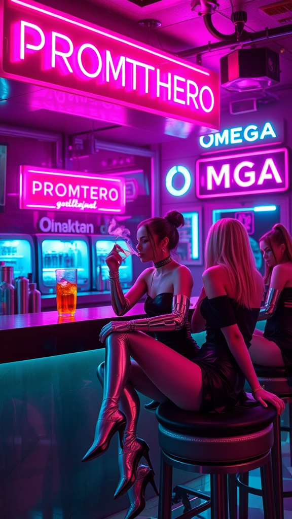 In a neon-drenched cyberpunk bar, several elegant women sit at the counter, their outfits a fusion of fashion and futuristic tech, with gleaming cybernetic limbs. One of them, a striking figure, leans casually on the counter, nursing a holographic drink in one hand and a sleek vape in the other, wisps of vapor curling into the air. The bar pulses with a mad neon noir ambiance, vibrant magenta lights casting shadows over a sign that reads "PROMTHERO," while a cool teal glow emanates from the "OMEGA" sign, illuminating the scene with a surreal, electric allure.
