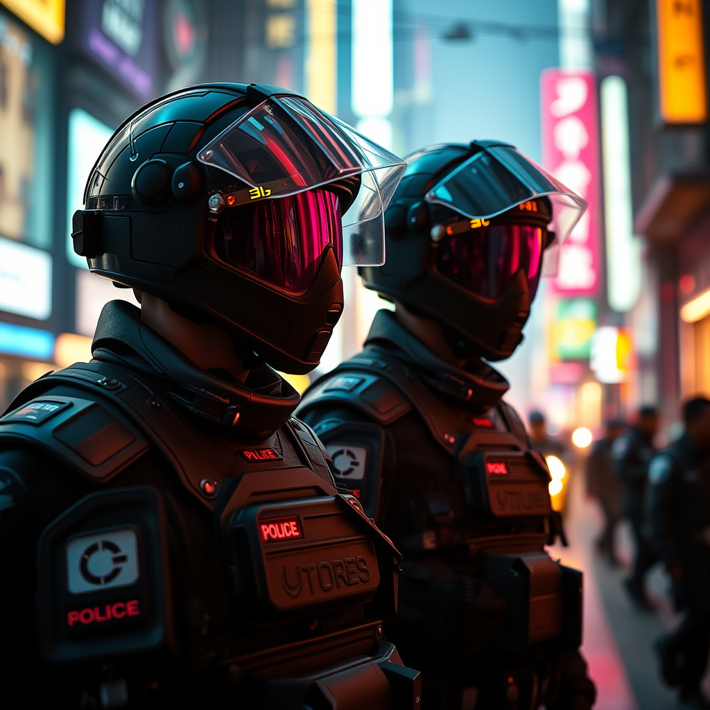 In a neon-drenched cyberpunk cityscape, officers clad in sleek, semi-heavy riot gear patrol the streets, their advanced helmets adorned with digital displays reflecting the vibrant urban glow. Intricate gear designs catch the eye under dramatic lighting, showcasing the meticulous craftsmanship. Photorealistic visuals elevate the scene into cinematic territory, with ultra-high-definition 8k clarity. Rendered with state-of-the-art technology, there is a dynamic depth of field that brings focus to the tension in the air, while the background fades into a symphony of blurred neon hues, capturing the essence of a futuristic metropolis in unrest.