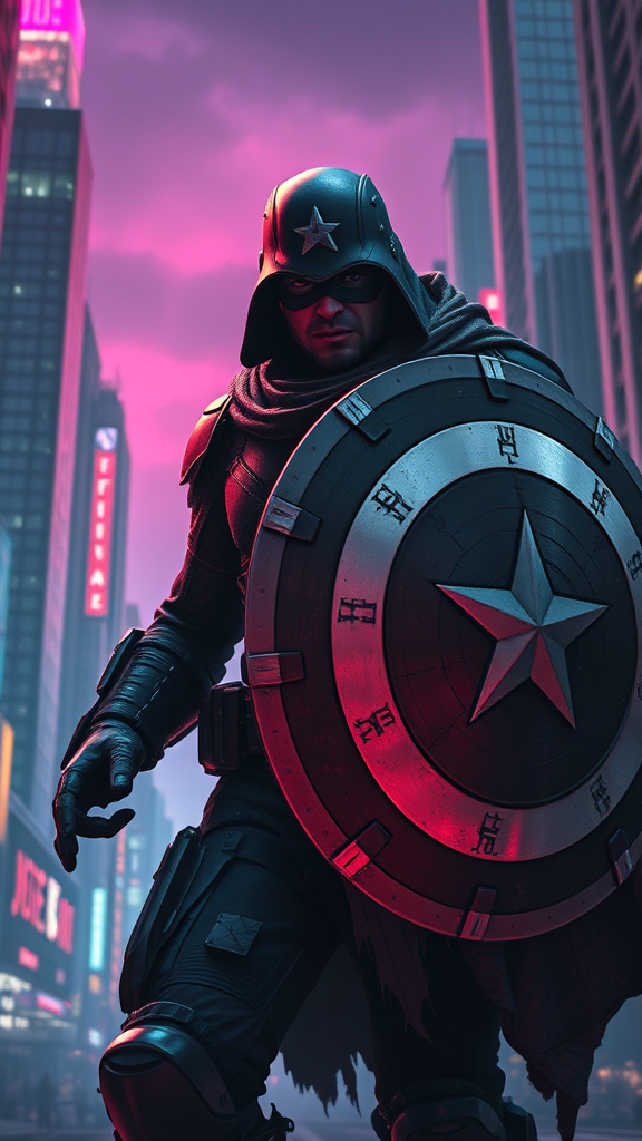 In a neon-drenched future where skyscrapers pierce the clouds and tech rules all, a twisted Captain America emerges. This shadowy figure, draped in dark, tattered armor reminiscent of fallen stars and brandishing an energy shield etched with unsettling symbols, navigates the chaotic streets of Cyberpunk 2077’s Night City. Corrupted by greed and power, he's a rogue agent with bio-enhanced abilities, leading a faction of cyber-mercenaries who exploit technology's darkest aspects. With a chilling determination in his augmented eyes, he seeks to enforce his own dystopian order, leaving a trail of shattered dreams and a city teetering on the edge of lawless oblivion.