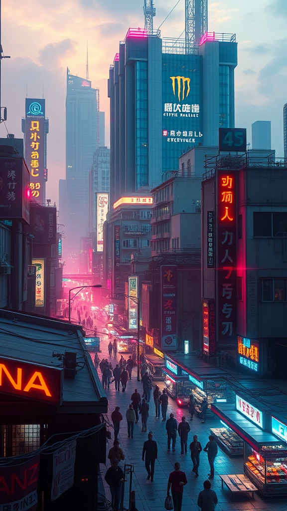 In a neon-drenched metropolis, society thrives as techno-organic beings interconnected through a web of augmented reality and neural networks, where the line between human and machine is blurred and the urban landscape pulses with the glow of street-level markets for consciousness upgrades and digital enhancements amidst the shadow of looming mega-corporations that control the flow of information and identity in a world where individuality battles against digital conformity.