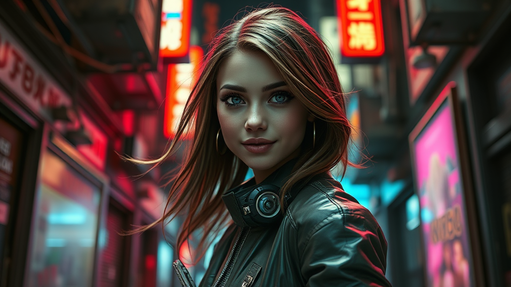 In a neon-lit alleyway of a sprawling nighttime city, a stunning young cyborg girl with pastel lighting casts a mysterious smile. Her bright, piercing eyes evoke the style of Deus Ex Mankind Divided. She's adorned in a fashion magazine-style blown jacket, its sleek design contrasting with the gritty slum surroundings. Her naturally glossy hair flows effortlessly, echoing a sense of vitality amidst the urban decay. The scene captures high clarity at 150mm and ISO 100, emphasizing the intricate details of her mechanical and human features. Despite the vibrant environment, the focus remains on her elegance and allure, free from digital imperfections, with every detail meticulously crafted to perfection.