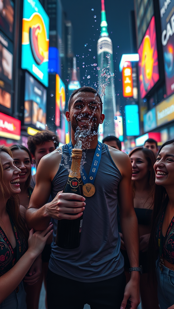 In a neon-lit cityscape, the summer night buzzes with electric energy. A victorious athlete stands proudly in a circle of jubilant friends and teammates, their faces illuminated by the vibrant glow of holographic billboards. Around his neck hangs a shimmering metallic medal with a holographic inscribed emblem. In his cybernetically enhanced grip, he holds a sleek, futuristic bottle of champagne. As he pops the cork, iridescent champagne foam bursts forth, casting prismatic reflections of the neon lights as it splashes in various directions. Laughter and excitement ripple through the group, adding to the vibrant atmosphere. The camera captures the scene from the front and slightly above, capturing the exhilaration and camaraderie, as the city's towering spires twinkle in the background.