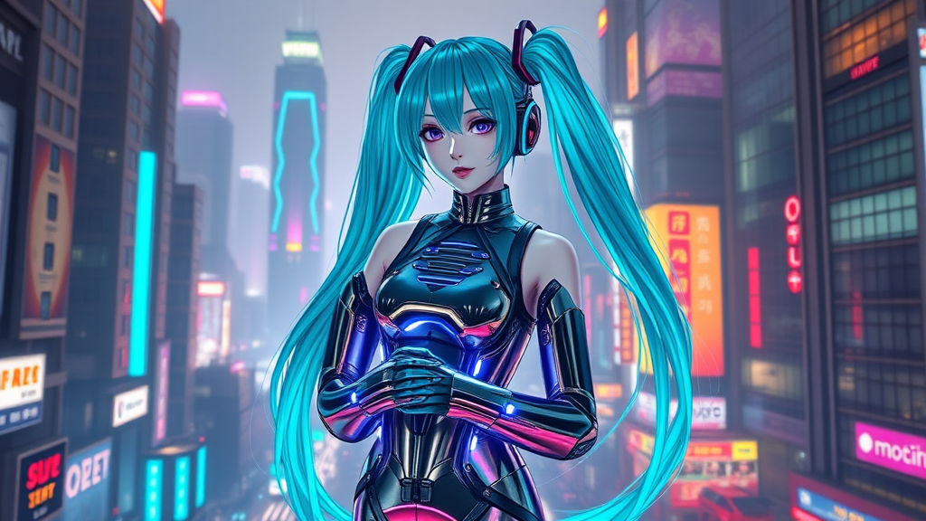 In a neon-lit cityscape where towering skyscrapers pierce the smog-filled sky, a futuristic diva named Miku takes center stage. Her holographic form flickers vibrantly against the buzzing chaos of the cybernetic metropolis, her long twin turquoise pigtails infused with strands of glowing fiber optics. Clad in sleek, metallic attire that reflects the city lights, she navigates the digital realm, her voice resonating with synthetic beats that echo through the bustling streets. With a virtual interface embedded into her gloves, she manipulates soundwaves like a maestro commanding an orchestra. Her performances attract a diverse audience, from augmented reality enthusiasts to renegade hackers, all captivated by her fusion of human emotion and mechanical precision. As she sings, her melodies blend with the hum of electric cars and the distant chatter of AI companions—a siren song for a world teetering on the edge of technology and humanity.