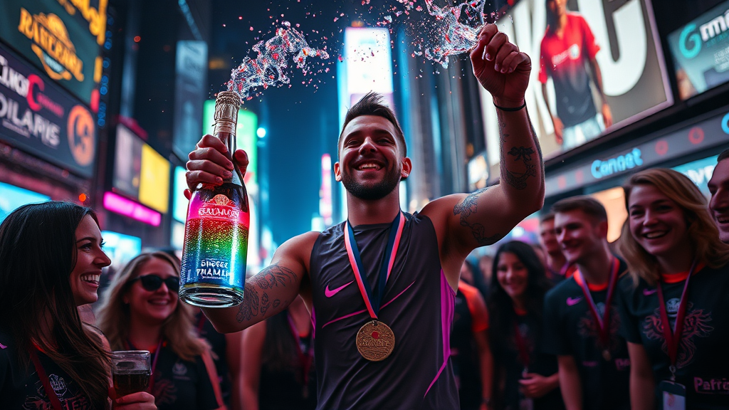 In a neon-lit cyberpunk cityscape, a triumphant winner adorned with a holographic medal stands amidst a jubilant gathering of friends and teammates, their faces aglow with vibrant LED tattoos. In his hand, he wields a sleek, futuristic bottle of champagne, its chrome surface glinting under the ambient city lights. As he jubilantly shakes the bottle, iridescent champagne foam erupts, splashing in a mesmerizing dance of colors and sparkling nanodroplets. The atmosphere buzzes with electric energy, harmonizing with the digital billboards that flicker above. The camera captures this moment from the front and slightly above, framing the scene in a kaleidoscope of colors and emotions, where cybernetics and celebration fuse into a spectacle of joy and unity.