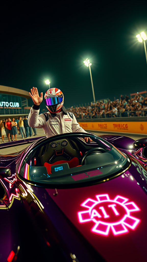In a neon-lit summer scene at the race track, a futuristic car emblazoned with a glowing auto club emblem gleams under artificial lights. Standing beside the vehicle is a racing driver, a visor reflecting vibrant hues as they fasten a sleek, holographic helmet with one hand while energetically waving to the cheering crowd with the other. The car's cockpit, curiously devoid of a steering wheel and visible helmet, adds to the mystery. Spectators are animated in the stands and beyond the translucent track boundary, their excitement palpable. The angle of view is dynamic, capturing the scene from slightly above, showcasing a cyberpunk world where technology and tradition collide.