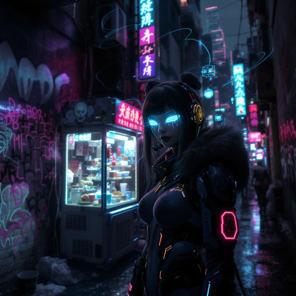 In a neon-lit urban landscape, a girl of the future stands before a sleek, high-tech food vendor machine, her cyberpunk attire blending seamlessly with the graffiti-laden, dark alleys around her. The cityscape gleams with moody lighting, casting shadows that accentuate the dystopian aura. Her eyes, enhanced with high-tech implants, flicker with data as she navigates augmented reality interfaces. The air buzzes with techno-noir energy as animated holograms dance around her, reflecting a vintage futurism aesthetic. This ultra-detailed scene captures her as a manga character brought to life, surrounded by futuristic gadgets and soaring skyscrapers in a vivid display of pan-futurism, melding the grimy with the sophisticated in a cinematic story of a gritty, yet high-tech world.