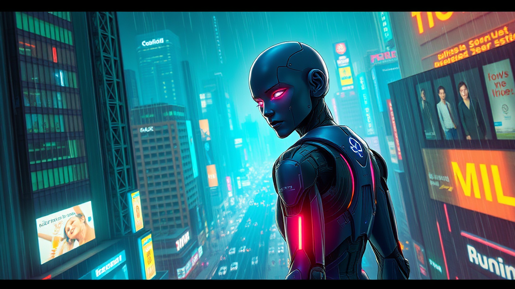 In a neon-soaked cyberpunk universe, a sleek android protagonist glances warily over their shoulder, glowing circuitry beneath synthetic skin reflecting the city's vibrant holographic ads; towering skyscrapers and bustling sky traffic surround them as rain drizzles through the haze, casting a shimmering veil over the sprawling urban landscape.