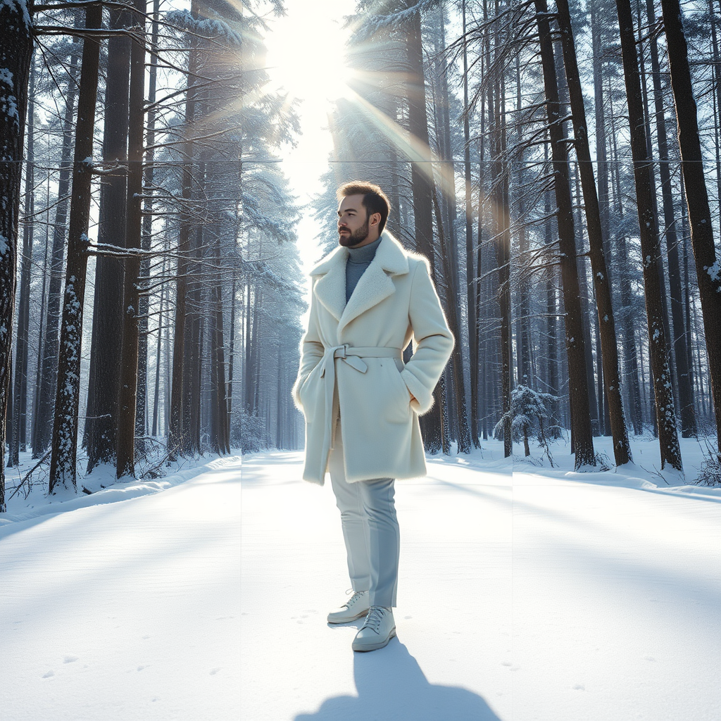 In a peaceful winter forest, a 30-year-old man, standing at 5'8", finds himself enveloped by a serene landscape. The towering trees, heavily dusted with snow, stand like silent sentinels. The ground beneath is a shimmering expanse of fresh, untouched snow, and the air is crisp with a stillness that feels almost magical. Strategically placed reflective panels surround him, capturing and multiplying his image, adding a touch of the surreal to the tranquil scene. He is clad in an opulent white mink coat paired with sleek white trousers that seamlessly blend with the snowy backdrop. The gentle rays of soft sunlight pierce through the canopy, casting a warm, luminous glow that heightens the mystical charm of the winter wonderland.