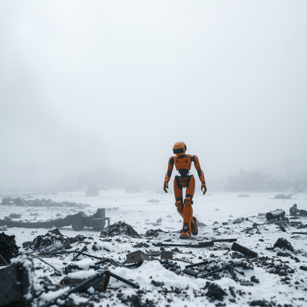 In a post-apocalyptic landscape, the scene unfolds with close-up shots capturing the eerie beauty of a ruined world. Mist clings to the snowy terrain, casting an ethereal veil over the desolate surroundings. Among the wreckage stands an orange robot, its vibrant hue a striking contrast against the monochrome backdrop. The camera's low angles emphasize the robot's journey through the foggy haze, each movement deliberate and imbued with an aura of mystery and resilience.