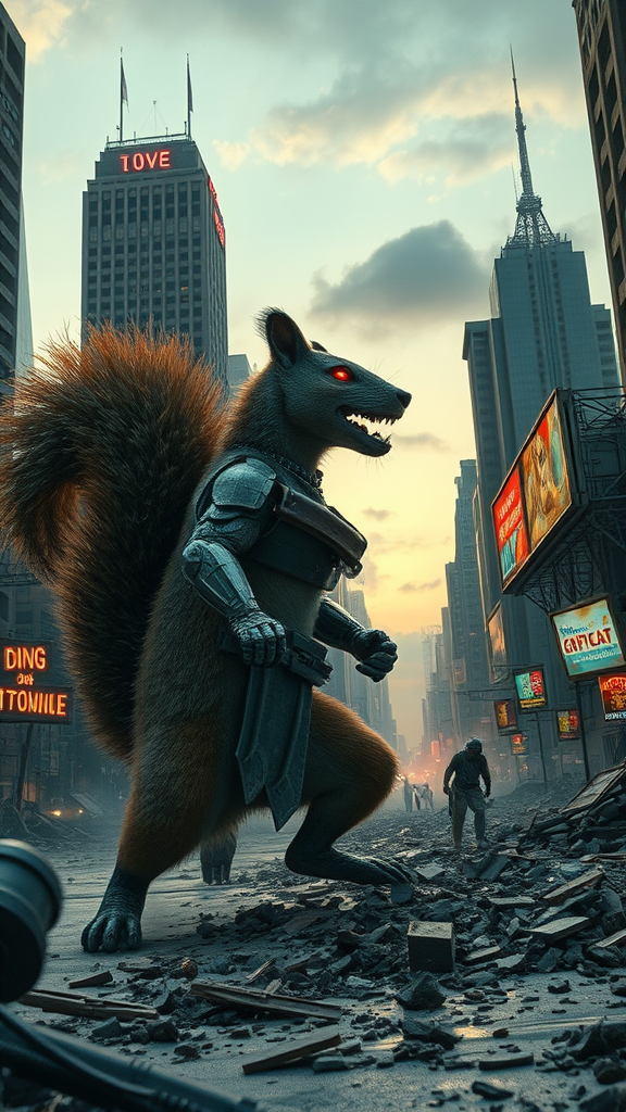 In a post-apocalyptic urban landscape, towering skyscrapers lie in ruins as a gigantic squirrel clad in battle armor fiercely clashes with a massive robotic dog. They trample through the debris-strewn streets, casting long shadows against the twilight sky. Neon lights flicker from toppled billboards, casting eerie glows on the chaotic scene. The squirrel, with its bushy tail acting as a formidable weapon, counters the metallic beast's powerful growls and glowing red eyes. Amid the crumbling remnants of civilization, this epic battle unfolds, echoing the primal struggle for dominance in a shattered world.