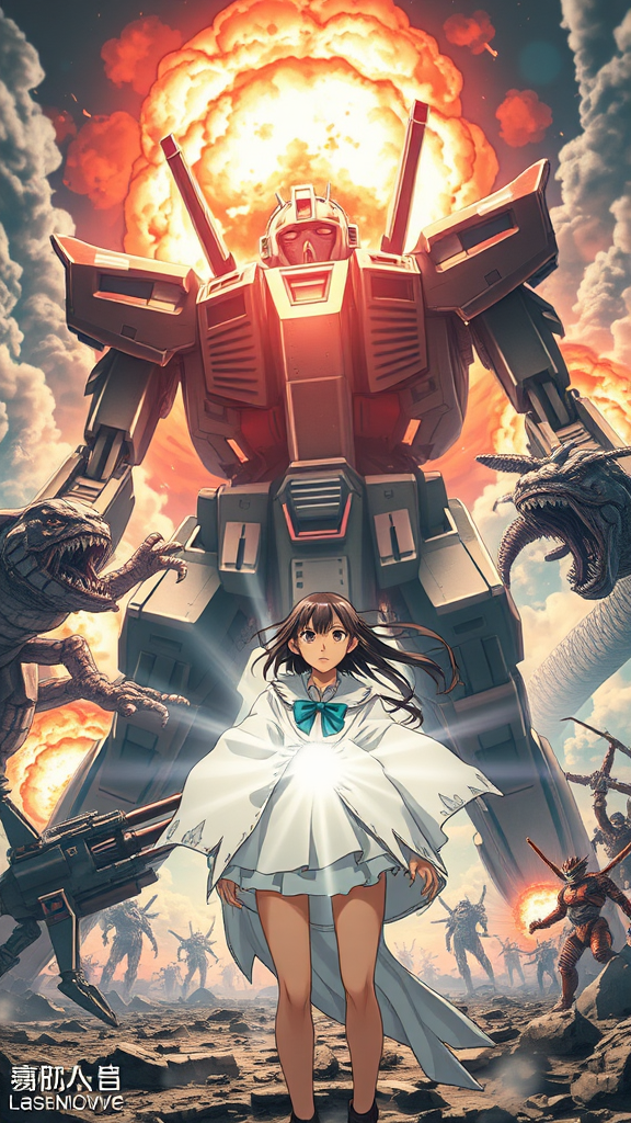 In a post-apocalyptic world where chaos reigns, an incredibly powerful Anime Girl stands at the center, emanating an aura of strength and determination. Created by visionary talents Hideaki Anno, Katsuhiro Otomo, and Rumiko Takahashi, this cinematic masterpiece captivates audiences worldwide. The movie poster showcases a breathtaking clash between massive mech creatures and grotesque monsters, their battle searing the sky with nuclear explosions in a symphony of fiery destruction. The main character, with radiant eyes and striking features, commands the scene with an air of mystery and power, embodying the theme of resilience against insurmountable odds. This highly detailed, stunningly rendered 8k image captures the essence of epic storytelling and visual grandeur, promising a box office hit that will not soon be forgotten.