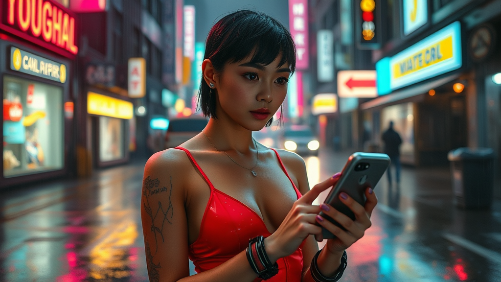 In a rain-soaked dystopian future, a captivating young woman stands amidst the atmospheric streets of a cyberpunk city. The neon lights reflect off the wet pavement, casting a vibrant glow onto her cyberpunk attire that accentuates her unique beauty. Her flat chest and small breasts are delicately highlighted, embodying a distinct charm as she skillfully interacts with a sleek, futuristic device. Her expressive eyes and sharply defined features are captured with expert photographic lighting that enhances the realism of the scene, rendering her exquisitely in stunning 10k resolution. Rain droplets cling to her vibrant attire and short hair, adding an element of dynamic motion, while the Blade Runner-esque surroundings pulsate with a life of their own, creating a mesmerizing, immersive portrait.