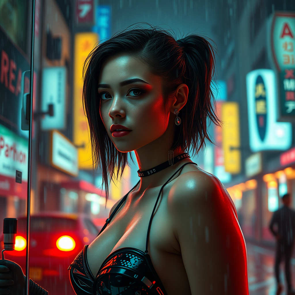 In a rain-soaked dystopian future, a young woman in striking cyberpunk attire stands amidst the iconic neon-lit streets reminiscent of a Blade Runner ambiance. Her androgynous beauty is accentuated by her flat chest and small breasts, which add to her distinctive allure. She is captured in a moment of intriguing action—perhaps hacking into a control panel or scanning the digital horizon—her concentration indicating a deeper narrative within this futuristic world. The scene is expertly illuminated with photographic lighting techniques, highlighting the realism of her features and the glistening raindrops that dance around her. The vivid details of her attire, complete with luminous accents and sleek, high-tech accessories, are rendered in exquisite 10k resolution, transporting viewers directly into this captivating universe.