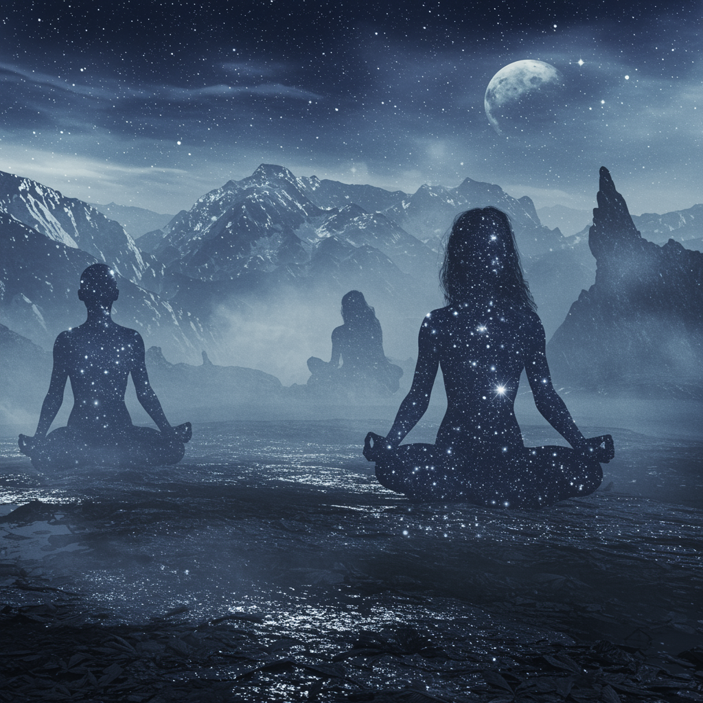 In a realm of surreal and dreamlike imagery, meditation unveils its own mysteries, where dark indigo swirls merge with shimmering silver, creating surrealistic dreamlike scenes. A celestialpunk landscape emerges, adorned with mist that weaves through the air like whispers of a forgotten dream. Unconventional poses are struck by ethereal figures, their forms draped in stardust, as they float effortlessly amidst the celestial haze. The atmosphere is a wondrous blend of tranquility and intrigue, where the boundaries between the conscious and subconscious blur, inviting the viewer to delve deep into the enigmatic essence of meditation's secret world.