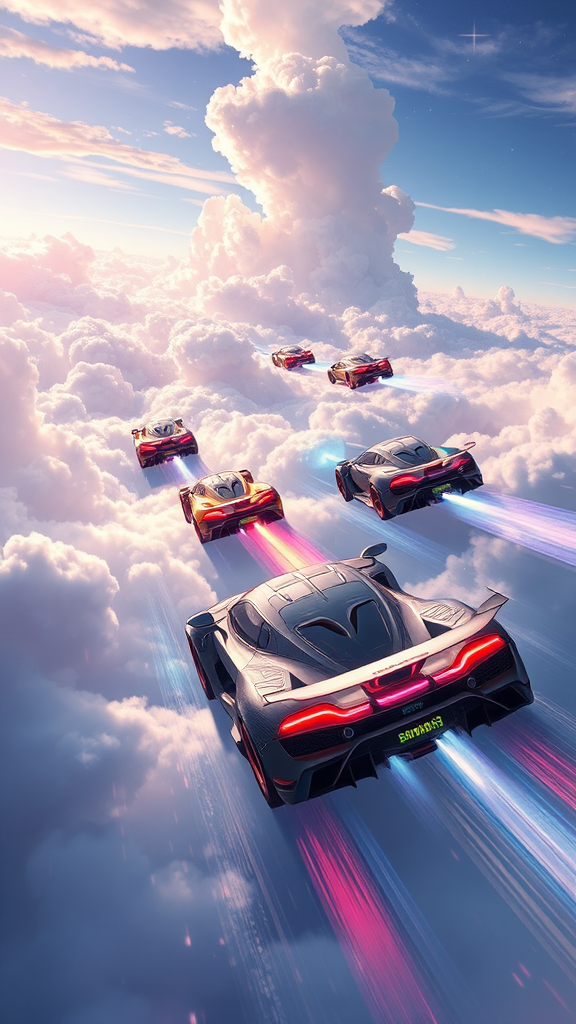 In a realm where magic and speed collide, an epic race unfolds among the clouds. Fantasy sports cars, imbued with mystical powers, dart through the sky, defying gravity with their enchanting speed. As they race across the heavens, the spirit of adrenaline and fierce competition echoes through the air. Participants, each with unique enchanted vehicles, maneuver through cloud loops and sky bridges, transforming the celestial horizon into a breathtaking raceway. The air crackles with excitement as drivers push the limits of their enchanted engines, chasing the thrill of victory and the allure of the finish line in this magical realm of racing wonder.