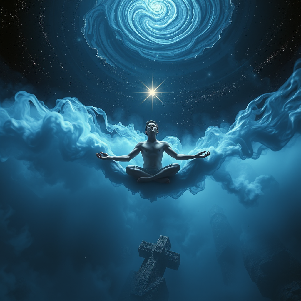 In a realm where meditation unveils itself as the ultimate secret, a figure floats amidst swirling dark indigo mists intertwined with tendrils of silver light. Surreal landscapes unfold with impossible dreamlike architectures, celestial bodies interspersed through an ethereal skyscape. The figure assumes unconventional poses, as if defying gravity, floating between realms of consciousness. Celestialpunk elements weave throughout, with stars twinkling like sentient beings whispering cosmic truths. Mist drifts in currents that redefine reality, melding the dreamscape's elements into an otherworldly tapestry, capturing the silent enigma of meditation within a surrealistic cosmic tableau.