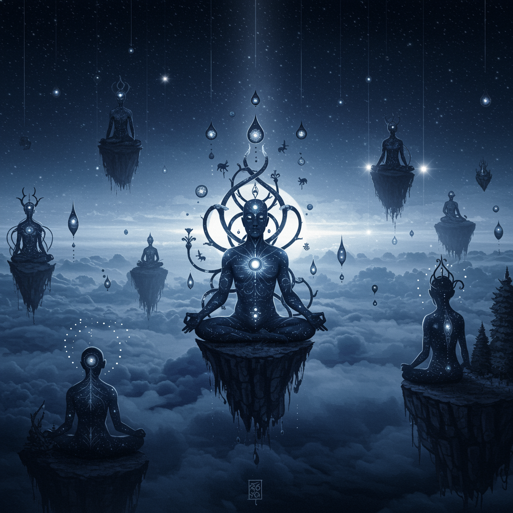 In a realm where meditation unveils the secret to itself, dreamlike imagery unfolds in a canvas of dark indigo and silver hues, ethereal mist swirling around celestialpunk landscapes. Surrealistic scenes emerge with unconventional poses, figures entwined with cosmic tendrils, their silhouettes shimmering against a backdrop of a moonlit horizon. Stars hang like luminescent droplets, casting shadows that dance in harmony with the rhythmic pulse of meditative whispers. Mystical beings, with eyes that hold galaxies, hover amidst floating islands where the boundaries between reality and reverie fade into a seamless tapestry of the subconscious, inviting the observer into an infinite voyage of introspection and serenity.