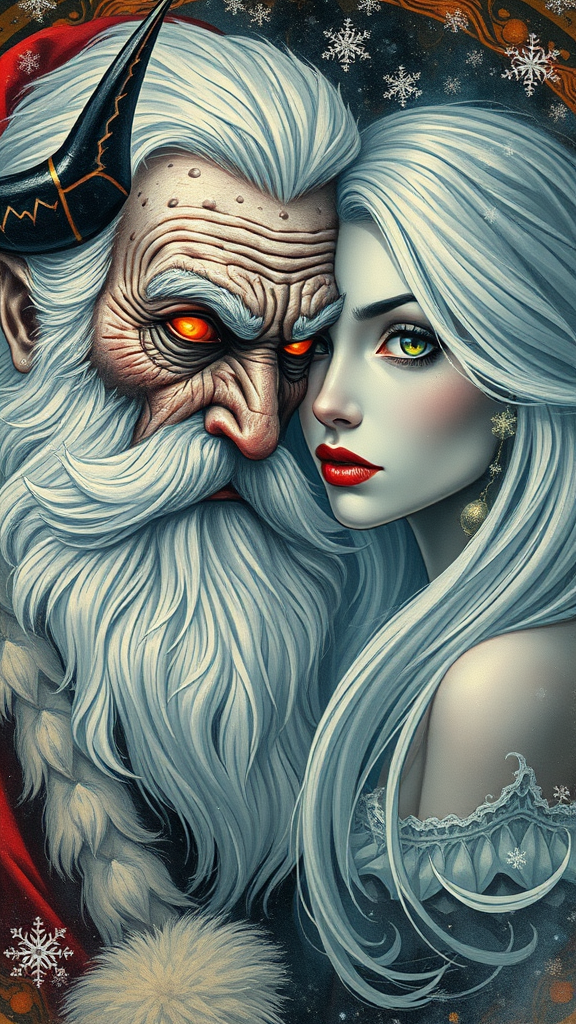 In a retro-futuristic blend of Art Nouveau and Cyberpunk, a double exposure digital painting emerges on a textured, cracked paper. The scene features a cyberdemonic old, white-haired Santa paired with a graceful Snow maiden woman, posed closely together in a detailed composition. Their expressions are vivid, with Santa's face displaying intricate demonic features and sharp, glowing eyes illuminating the detailed shadow play across his visage. The Snow maiden's face is perfectly crafted, embodying a luminescent beauty, with intricate details outlining her long neck. The artwork captures elements from artists like James Jean and Dorian Vallejo, incorporating stained glass influences and storybook illustration vibes. The piece exudes high-quality craftsmanship, boasting intricate lighting and delicate details that form a masterpiece. Humble and tiny, creative modifications highlight the unique beauty within this dynamic and detailed portrait. Avoiding distortions, every element is harmoniously balanced, retaining the core artistry without succumbing to kitsch or poor anatomy.