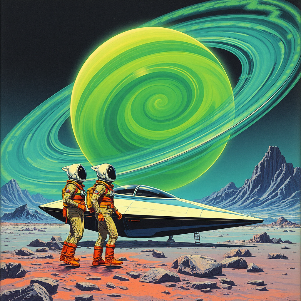 In a retro science fiction scene reminiscent of 70s book art, an alien spacecraft with sleek, angular lines is nestled on the surface of a mysterious exoplanet. Twin astronauts, clad in vintage space suits with reflective visors, stand in awe beside the craft, surveying the alien landscape. Towering in the background is a vibrant green gas giant, its swirling clouds creating mesmerizing patterns in the planet's thick atmosphere. The scene is bathed in an otherworldly palette of deep blues and vibrant greens, capturing a sense of wonder and exploration amidst the vastness of space.