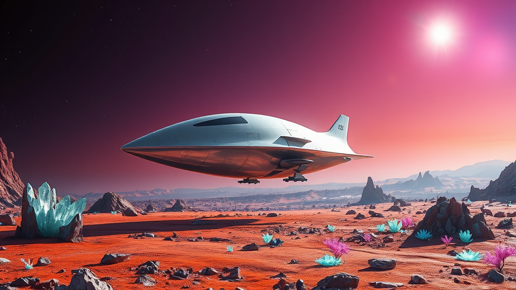 In a scene straight out of a science fiction epic, a sleek, silvery spaceship descends gracefully onto a vibrant alien planet. Its design is both futuristic and elegant, with smooth curves and metallic textures that catch the sharp, contrasting light from a distant star. As the spaceship gently touches down on the planet's surface, the landscape around it comes alive with color and texture. Jagged, crystal-like formations jut out from the ground, reflecting prismatic lights, while patches of luminescent flora glow softly in shades of blue and green. The atmosphere is thin, casting long, dramatic shadows as the spacecraft's landing gear makes contact with the rocky terrain. Overhead, a sky tinged with hues of violet and orange stretches infinitely, dotted with the glittering forms of distant celestial bodies. The scene is a harmonious blend of advanced technology and untouched natural wonder, inviting exploration and discovery in equal measure.