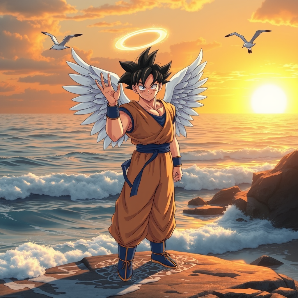 In a serene coastal setting, Goku stands with a gentle smile, angelic white wings unfurled, and a shimmering halo resting above his head. The ocean waves gently lap at his feet as he waves farewell, his eyes reflecting a sense of peace and farewell. The golden glow of the sunset bathes the scene, casting a warm light that accentuates the tranquil beauty of the moment. With seagulls soaring nearby, the horizon stretches endlessly, capturing the timelessness of his departure.