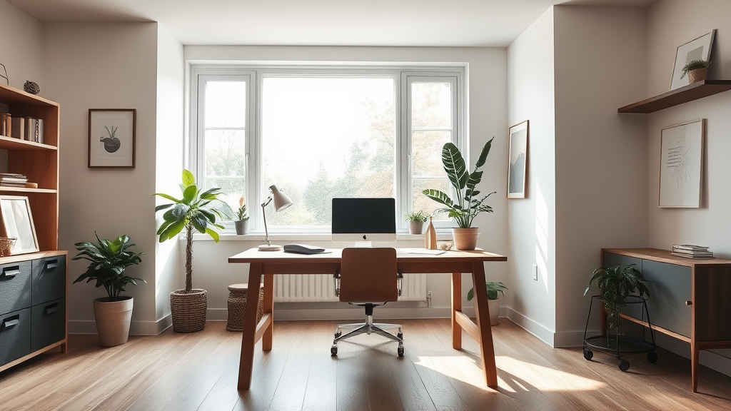In a serene Scandinavian home office, a sleek natural oak desk takes center stage, bathed in soft ambient light filtering through an expansive window. The low-angle perspective enhances a sense of spaciousness, while minimalist decor and earthy tones evoke a calming, productive atmosphere, dotted with lush green plants adding a touch of nature.