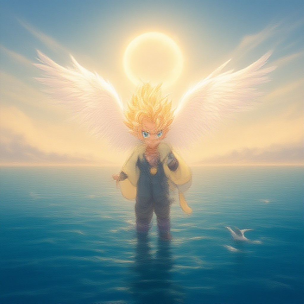 In a serene scene over a vast ocean, the iconic character resembling Toriyama Akira's Goku stands gracefully with majestic, white angel wings unfolding from his back. A soft, luminous halo floats above his head, casting a gentle glow around him. He waves goodbye with a serene and gentle expression, as the sea breeze gently ruffles his spiky hair. The deep blue ocean stretches endlessly, reflecting the warm hues of the setting sun, creating a sense of peace and farewell. A few seagulls glide in the background, completing the tranquil and bittersweet moment.