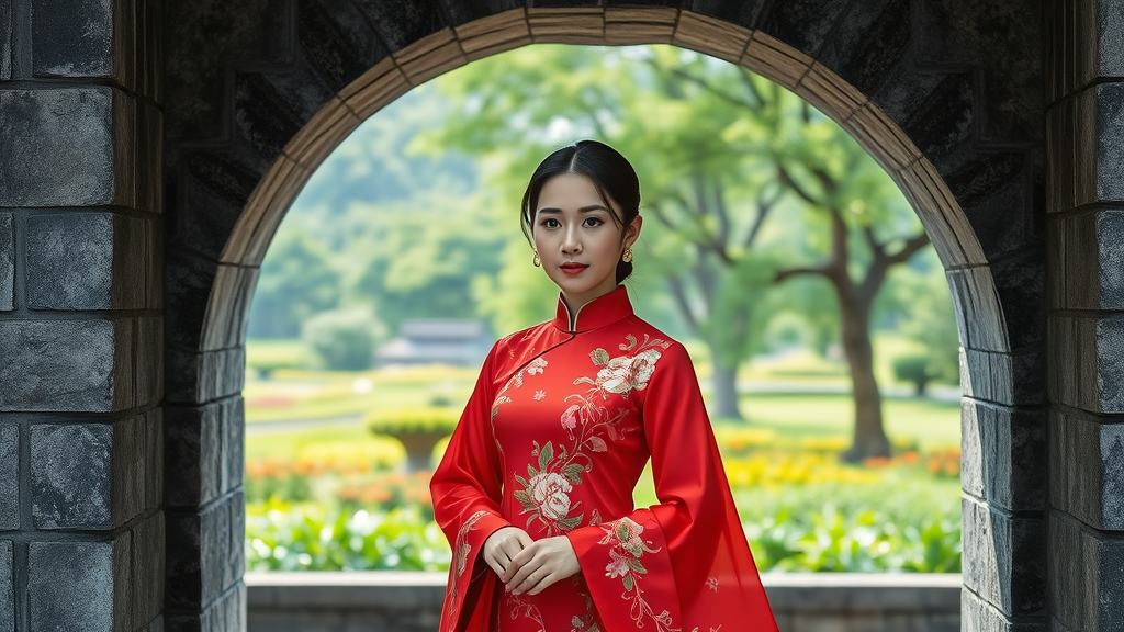 In a serene setting beneath an ancient stone archway, a young woman stands as the centerpiece of the scene. She wears an elegant traditional Chinese dress, featuring intricate floral designs and flowing sleeves. The vibrant hues of her attire stand in striking contrast against the subdued shades of her surroundings. Her expression is thoughtful, adding a layer of enigma to her presence. The archway frames her elegantly, directing the viewer's gaze squarely towards her. The stone structure exudes a rustic charm, its gray tones harmonizing beautifully with the lush greenery that spreads across the backdrop. A vibrant garden stretches out behind her, brimming with lush foliage and majestic trees. The garden's deep greens infuse the scene with a sense of peace and tranquility. Gentle lighting bathes the image, casting delicate shadows and highlighting the intricate textures of the stone and the woman's dress. This soft illumination creates a welcoming atmosphere, further enhanced by a subtle pastel color grading that lends the entire scene a calming and ethereal quality.