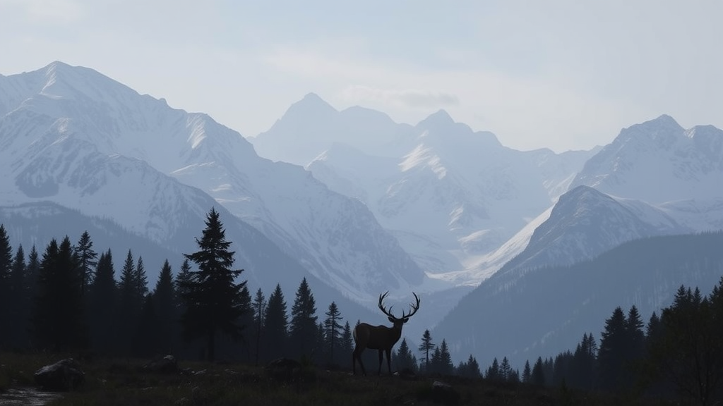 In a serene, yet haunting landscape of majestic snow-capped mountains, a lone deer stands as a silent sentinel. The air is filled with an eerie stillness, broken only by the distant, unsettling moans of the undead, reminiscent of an apocalyptic world. Shadows shift between the trees, where nature struggles against the encroaching presence of zombies, creating a juxtaposition between the beauty of the untouched wilderness and the looming threat of a world consumed by chaos.