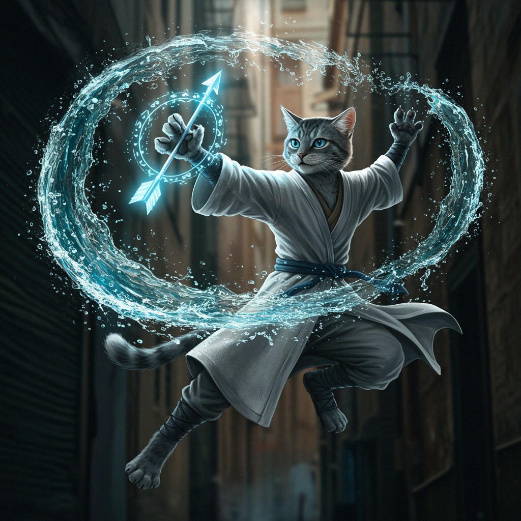 In a shadowy urban alley, an anthropomorphic feline, clad in flowing white linen robes, is captured in a dynamic mid-air pose. The cat wields an arrow-shaped symbol, channeling a powerful torrent of swirling water that dances around its deftly positioned paw. Illuminated by a mystical blue radiance, the cat's face and body exude an ethereal glow, accentuated by the complex patterns of swirling magical effects and undulating waves of energy that encircle it. The cat locks its piercing eyes onto the viewer, as if caught in a cinematic freeze-frame, rendering the scene with hyper-realistic detail and capturing the intense, action-packed atmosphere of a widescreen movie still.