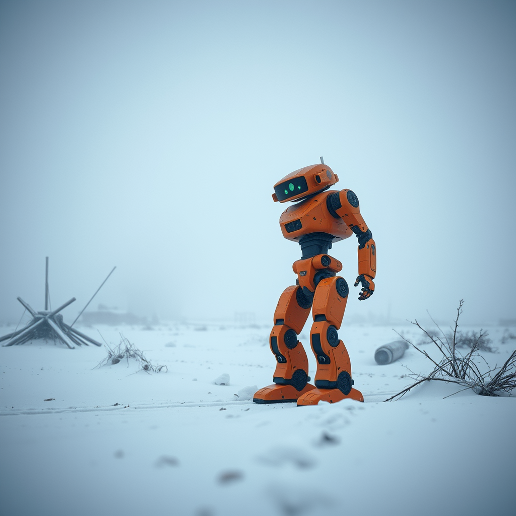 In a snowy, fog-laden post-apocalyptic landscape, an orange-hued robot stands resilient amidst the desolation, captured in intimate close-up shots from low angles that emphasize its stark contrast against the wintry backdrop, its sensors glowing subtly as it navigates the eerie silence, the world around it both haunting and breathtaking in its icy desolation.
