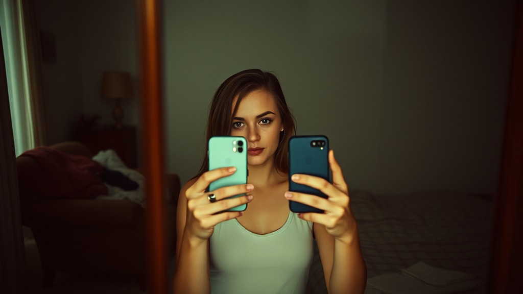 In a softly lit room, a woman poses in front of a mirror, capturing a selfie with a vintage vibe. The image quality is nostalgic, characterized by a grainy texture that adds to the photo's charm. The low lighting creates moody shadows, partially veiling her features. Surrounding her is a scene of casual disarray—a pile of clothes spills over an armchair, and the blanket on the bed is crumpled. Her expression is relaxed yet focused, while her old smartphone tries to lock in on the details, resulting in an authentic and unrefined snapshot. The mirror bears traces of daily life—smudges and fingerprints—enhancing the candid, everyday essence of the moment.