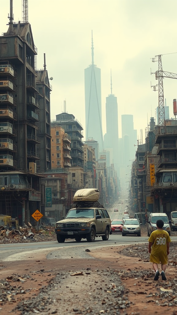 In a somber, post-apocalyptic urban sprawl lies a deformed and noisy landscape where bleakness reigns amidst vibrant splashes of unexpected color. Towering structures, once grand, now crumble in dramatic decay under the shadow of a simple, ugly skyline. A single, engine-powered car, battered and barely functional, weaves through the city’s blurry streets, offering a low contrast to its intricate surroundings. Despite the desolation, a thread of optimism weaves through the fabric of this world, where cheerful hues burst forth from neglected corners, as if nature herself insists on bright resilience in the face of overwhelming bleakness.