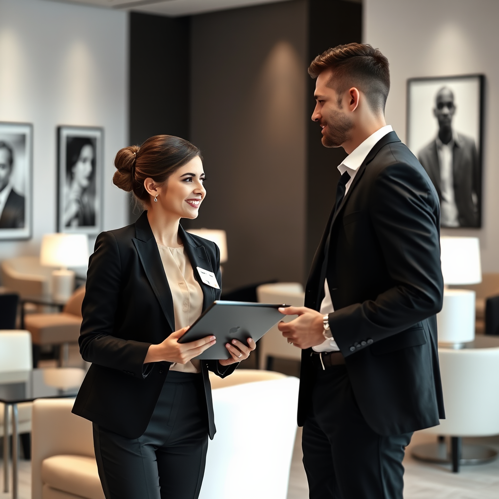 In a sophisticated business lounge with an elegant, modern décor, a female employee and a male visitor are engaged in a professional interaction. The woman, dressed in a sleek black blazer adorned with a name badge and a soft beige blouse, has her hair styled in a polished bun. She holds a sleek tablet in her hands, occasionally glancing at it to take notes as she maintains eye contact with the man, her expression warm and approachable. His attire is sharp, featuring a classic black suit paired with a crisp white shirt, his side profile displaying a poised demeanor. The setting exudes an upscale ambiance with contemporary art pieces and striking black-and-white photographs adorning the walls. The subdued lighting casts a refined glow over the scene, complementing the primarily monochromatic color scheme that underscores the sophisticated atmosphere.