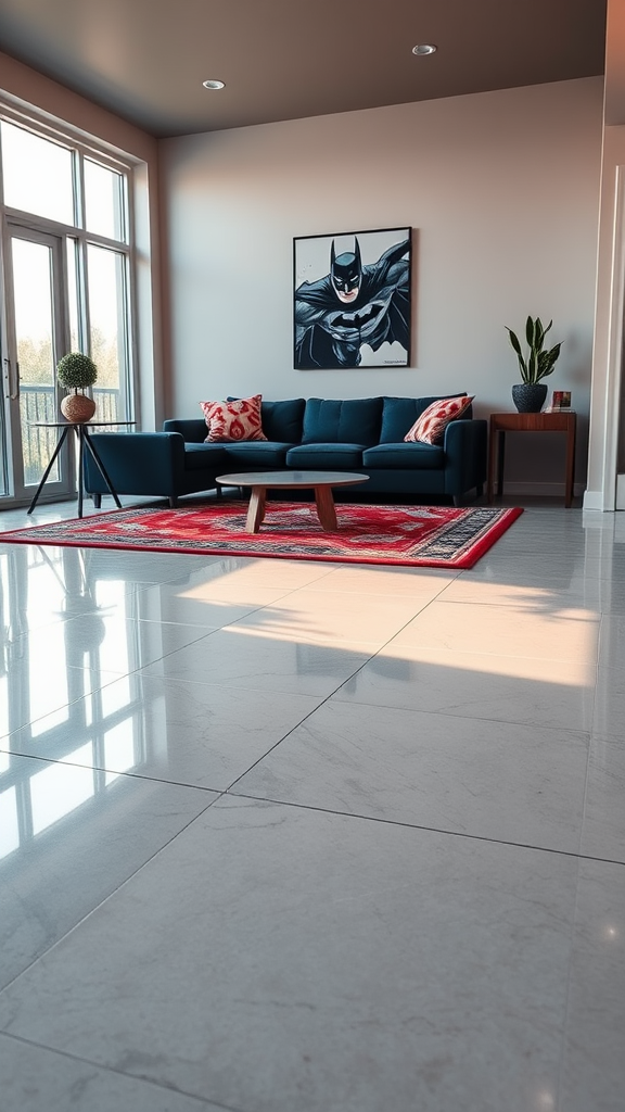 In a spacious contemporary lounge during the morning, a gleaming polished tile floor reflects the soft glow of natural light streaming through large windows. A richly textured rug, vibrant and intricate, anchors a dark blue sofa set that offers a touch of elegance and comfort. On the wall, a striking illustration of Batman in dynamic, bold lines adds an artistic focal point to the room. Beside the sofa, a sleek wood side table provides a balance of functionality and style. The overall ambiance is calm and sophisticated, capturing the essence of a modern living space in ultra-high definition, maintaining a raw and unfiltered aesthetic.