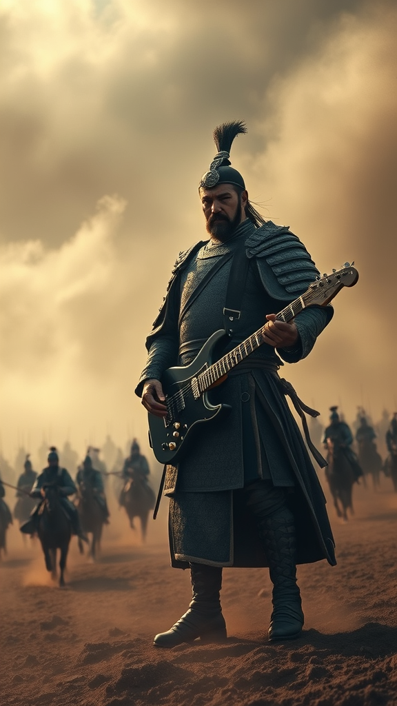 In a sprawling battlefield shrouded in swirling dust and smoke, the general of the Qin Dynasty stands resolute, electric guitar in hand, his traditional armor gleaming under the dim, hazy light. Behind him, an army on horseback charges forward, their silhouettes a striking backdrop against the expansive horizon. The scene captures a moment frozen in time, a blend of ancient valor and modern expression. Panoramic and hyper-realistic, the portrait conveys a sense of power and imagination as history and fantasy intertwine.