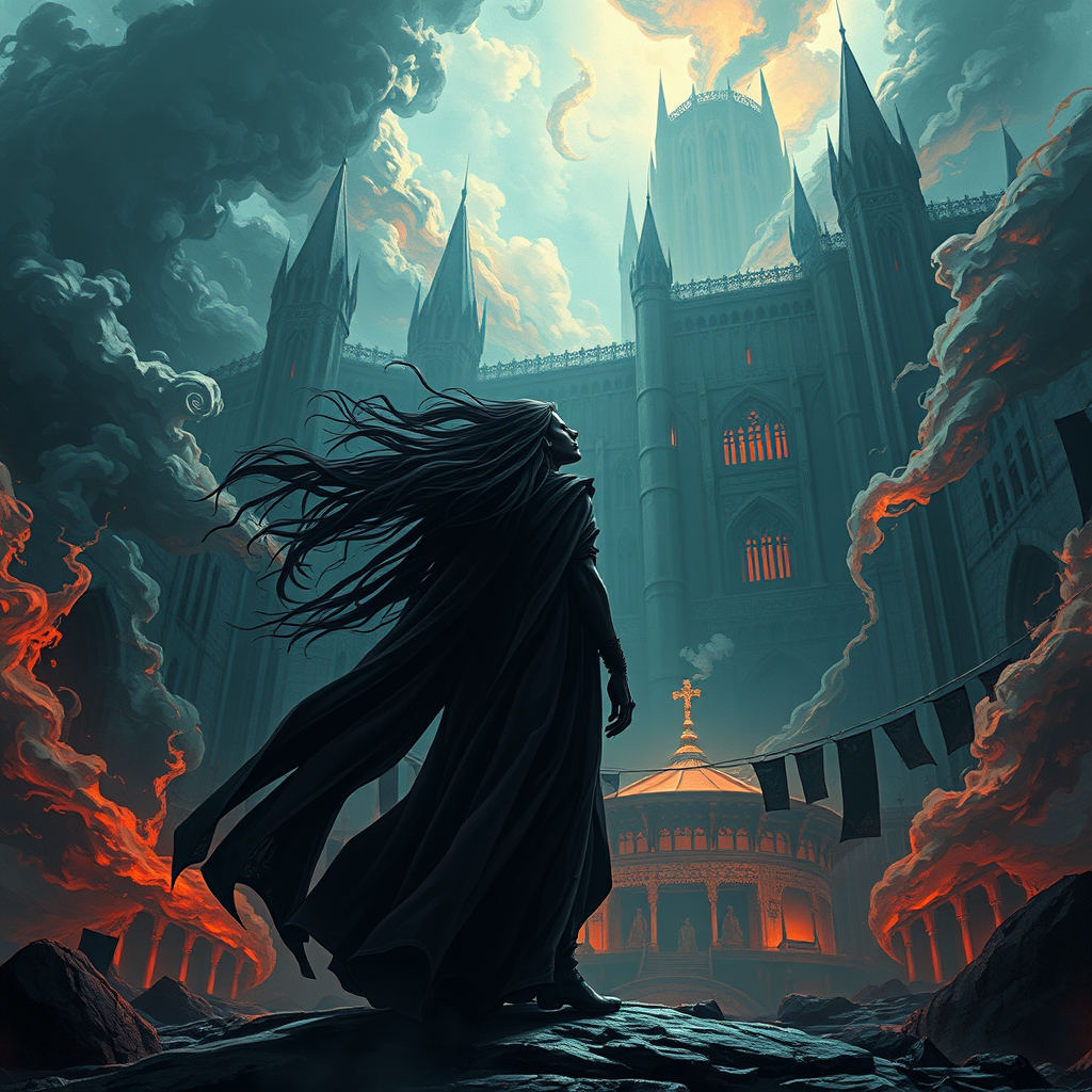 In a sprawling cinematic royal scene, a figure stands with long, windblown hair and flowing cloth, engulfed in darkness that intertwines with vibrant contrast akin to Magic the Gathering. Toxic clouds and spirals of smoke conjure ghostly forms in the backdrop of an enormous, shadowy castle. Inspired by Massimo Caggese, the intricate details are akin to Moebius, capturing a gorgeous pose worthy of ArtStation's finest. The scene is enriched by Unreal Engine's capabilities, with dramatic lighting and shadows enhancing orthodox symbolism. This concept art blends magic realism with ambient occlusion, accentuated by volumetric lighting, offering a deeply emotional narrative. Set in 8k resolution, it reflects tribal dark fantasy with subtle creative nuances.