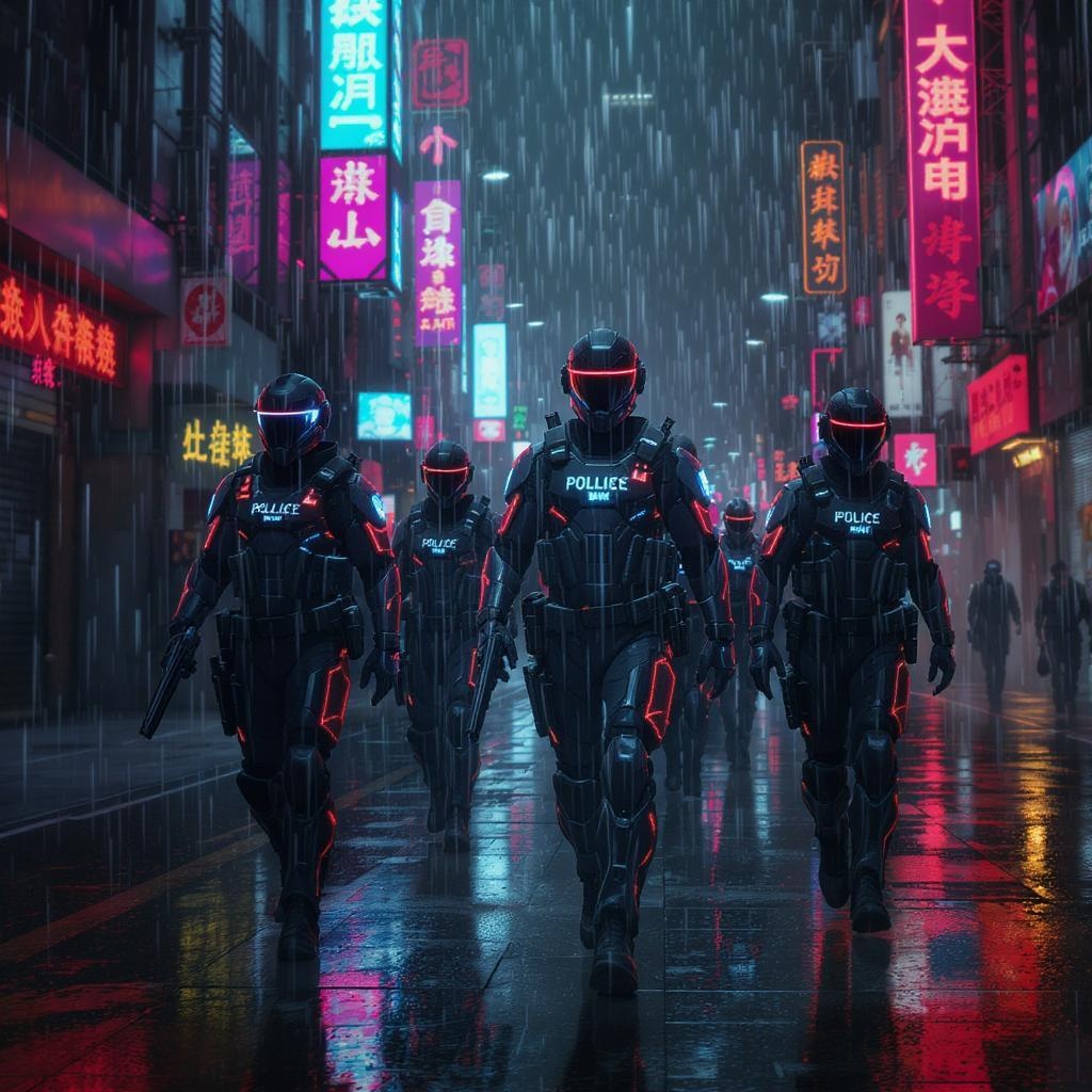In a sprawling cyberpunk metropolis, law enforcement officers patrol the rain-slicked streets adorned in sleek, futuristic riot gear with an intricate, lightweight design. Their advanced helmets glisten with neon light reflections, echoing the vivid luminescence of nearby holographic billboards. Each officer moves with precision, their armor a marvel of engineering with fine details that hint at cutting-edge technology. The scene is bathed in dramatic, cinematic lighting, capturing the essence of a world where shadows and bright neon coexist in harmony. Photorealistic rendering brings the scene to life, enhanced by an 8K resolution that reveals every nuance. The image is crafted in an unreal engine with octane render, featuring a delicate depth of field that draws focus to the officers against the blurred, bustling backdrop of the city.