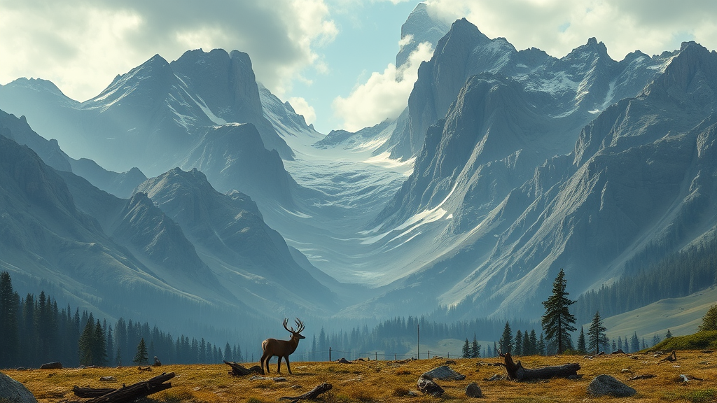 In a sprawling landscape of daunting majestic mountains, a lone deer grazes amidst the silence, as if unaware of the lurking danger. The world is a haunting tapestry of wilderness reclaiming civilization, where the echoes of humanity's past are overshadowed by the presence of relentless, shambling zombies that stalk the remnants of a once-vibrant earth.