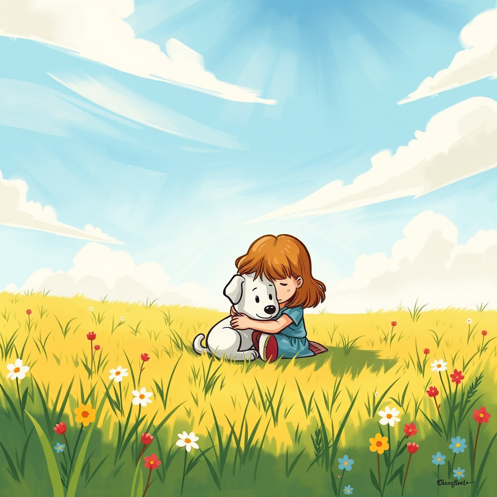 In a sprawling meadow beneath a sky brushed with soft hues of blue, framed by vibrant greenery, a lovable puppy nestles comfortably in the gentle embrace of a young girl. The scene is bathed in the golden warmth of the spring sun, capturing their shared joy. Rendered in a style reminiscent of Charles M. Schulz, the heartwarming moment springs to life with subtle lines and expressive detail, highlighting the innocence and serenity of this peaceful encounter.